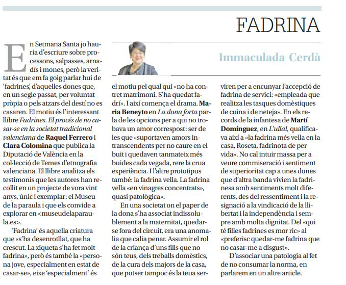 La cap del Servei de Normalització Lingüística de la Diputació de València i acadèmica de l’AVL, Immaculada Cerdà publica al març de 2021, al periòdic Levante, un article amb el títol Fadrina.